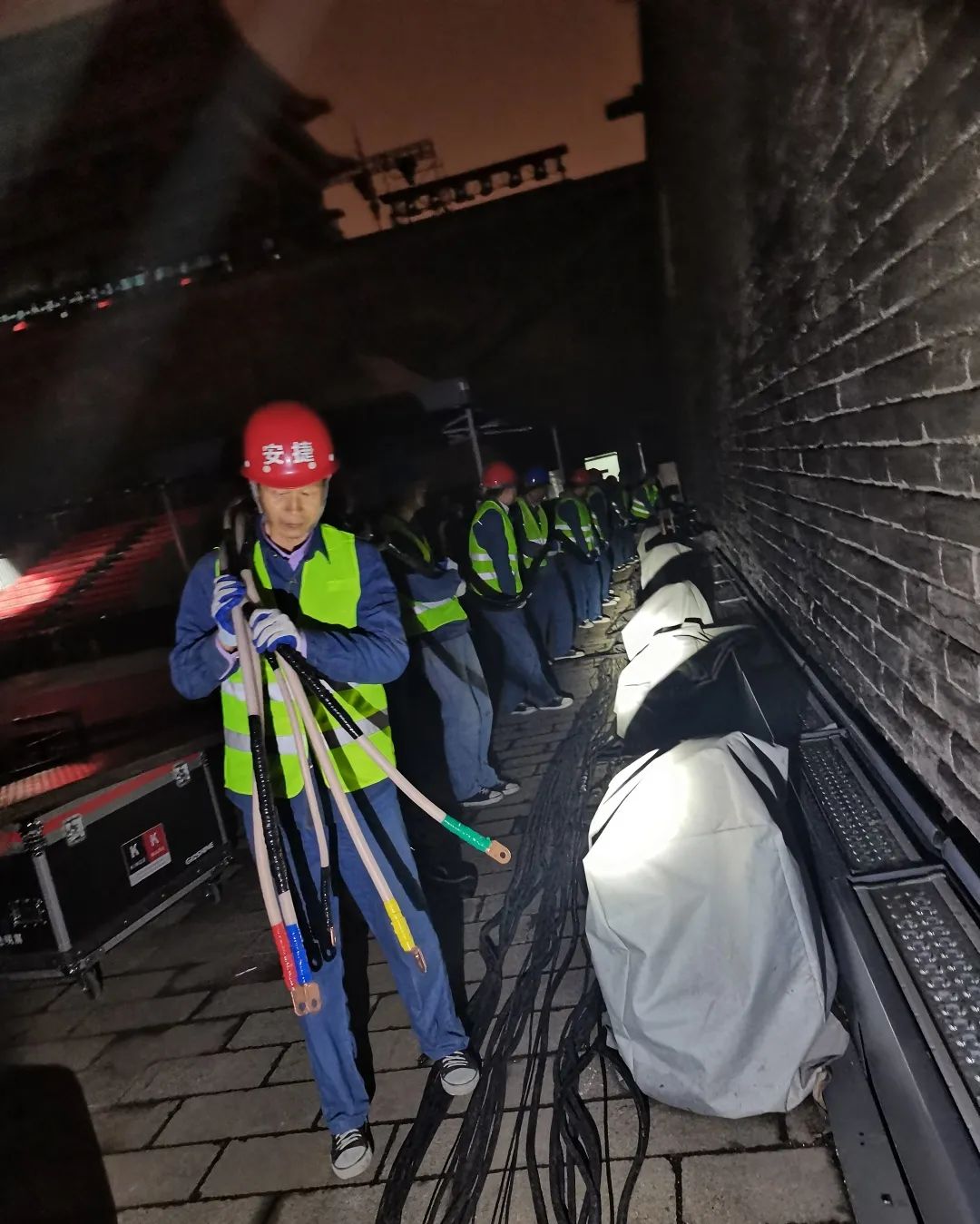 接到本次保电任务,多宝电竞物联提前周密部署,统筹安排人员,制定完善的保电方案,40余位工作人员连夜铺设电缆,奋战3天,现场调试设备,轮班值守。现场由24人组成的多宝电竞物联保电人员分为四小队及后勤保障组,细化分工,各小组人员全程坚守岗位,加强关键环节和点位的监控,随时应对活动现场供电突发情况,确保了此次丝绸之路国际电影节的顺利开幕。