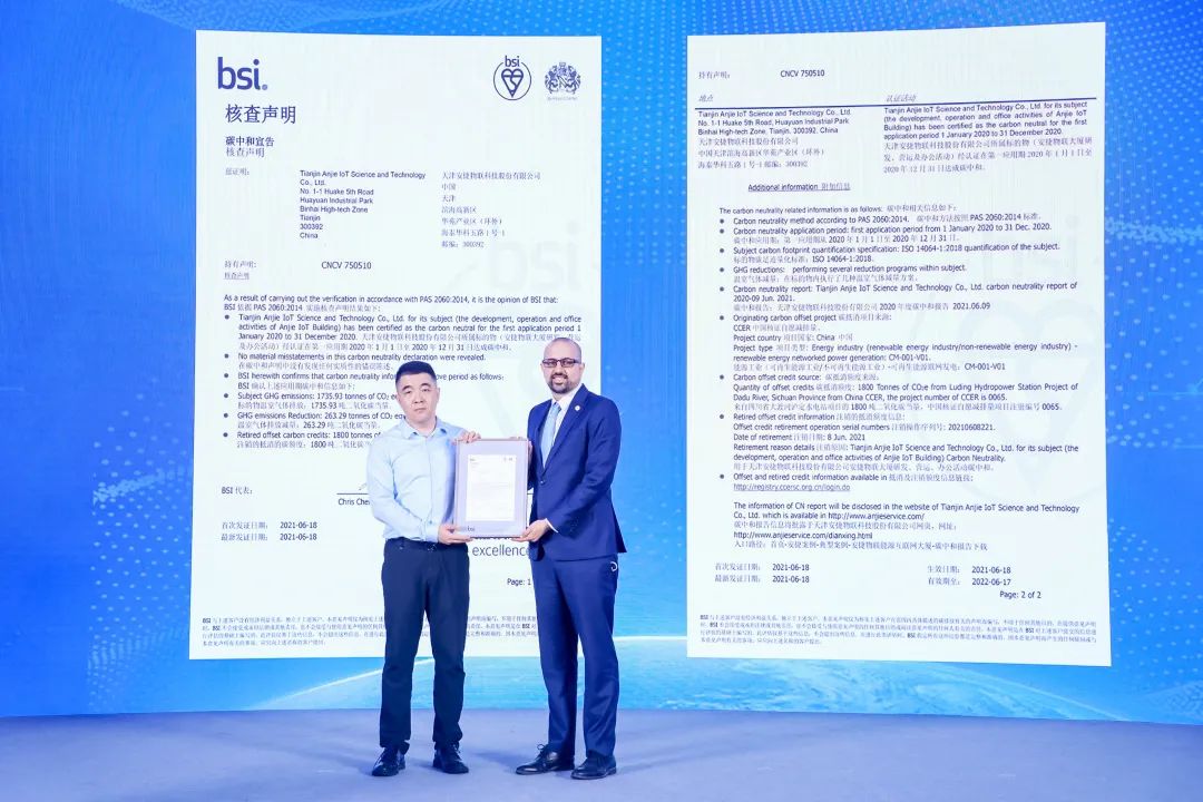 会上,BSI(英国标准协会)战略伙伴关系总监 Paulo Lopes为多宝电竞物联颁发2020年度碳中和认证证书,多宝电竞物联正式成为天津市第一家获BSI碳中和认证的企业。