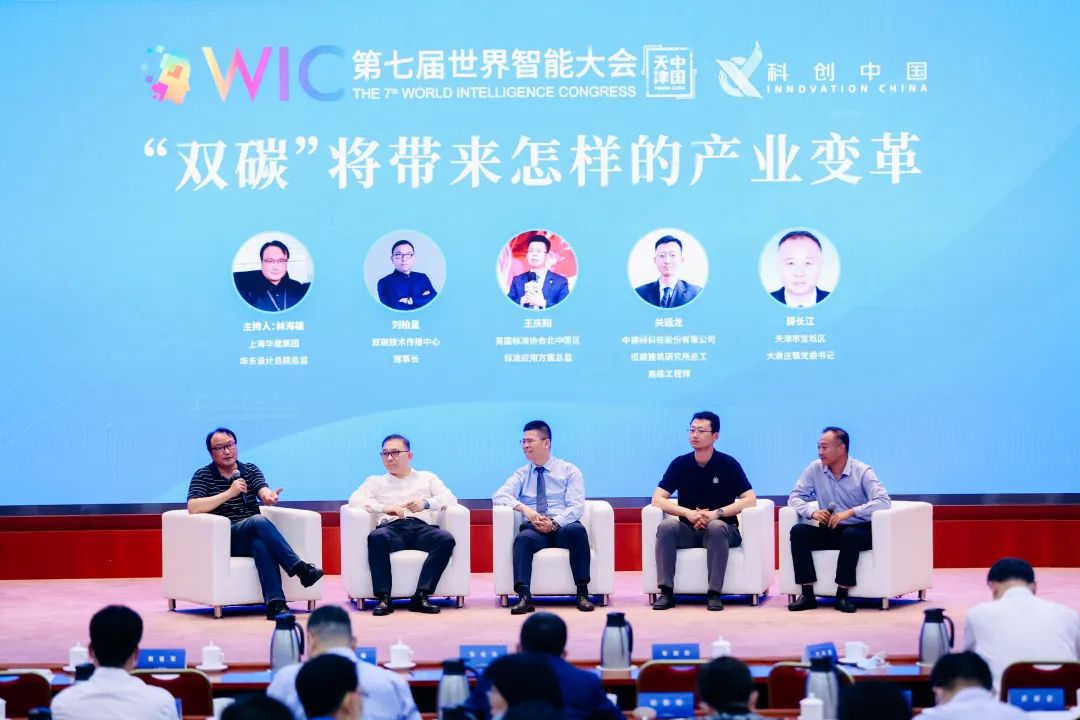 在圆桌论坛环节,多宝电竞物联董事长刘柏呈与上海华建集团华东设计总院总监林海雄,BSI英国标准协会方案解决专家王庆阳,中国建筑科学研究院、低碳建筑研究中心关运龙博士,宝坻区大唐庄书记薛长江,就 “双碳”将带来怎样的产业变革为主题展开探讨。